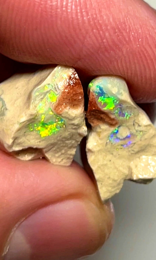 49cts Coober Pedy Rough Seam Opal pair of splits Crystal with gorgeous bright colours 24x20x5 to 17x12x7mm SKU#9462