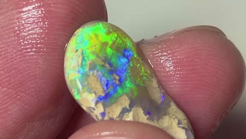 Yellow/Blue/Green dominant Very Bright Multifires 7.30cts Lightning Ridge knobby opal rub/rough 21x12x3mm SKU#RLN011