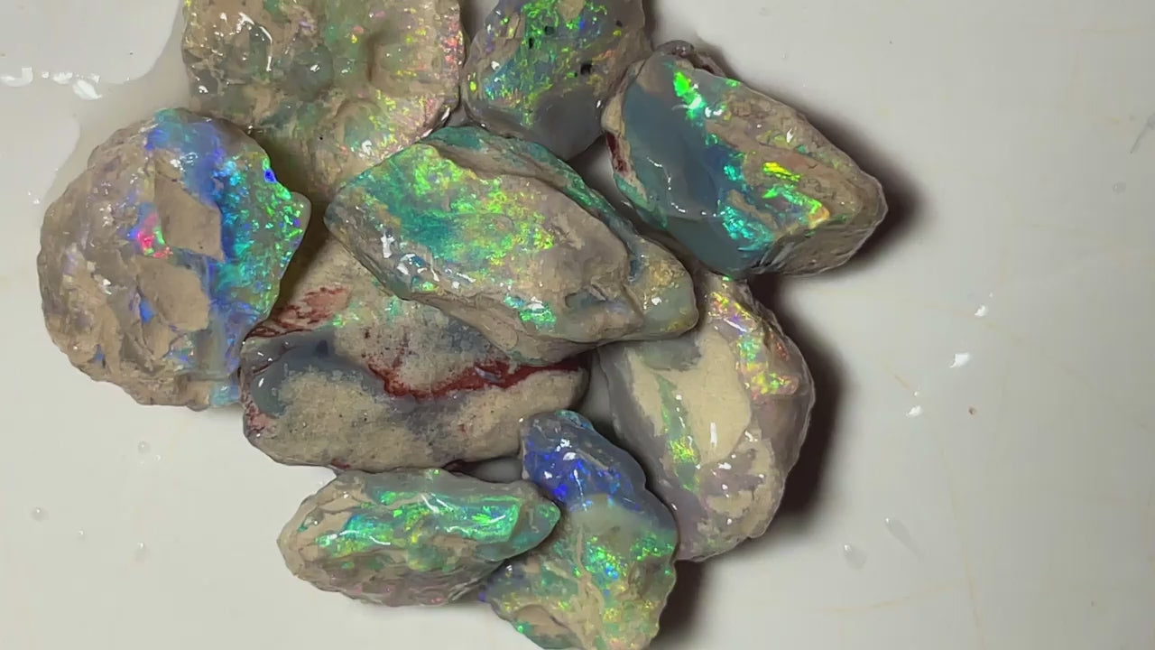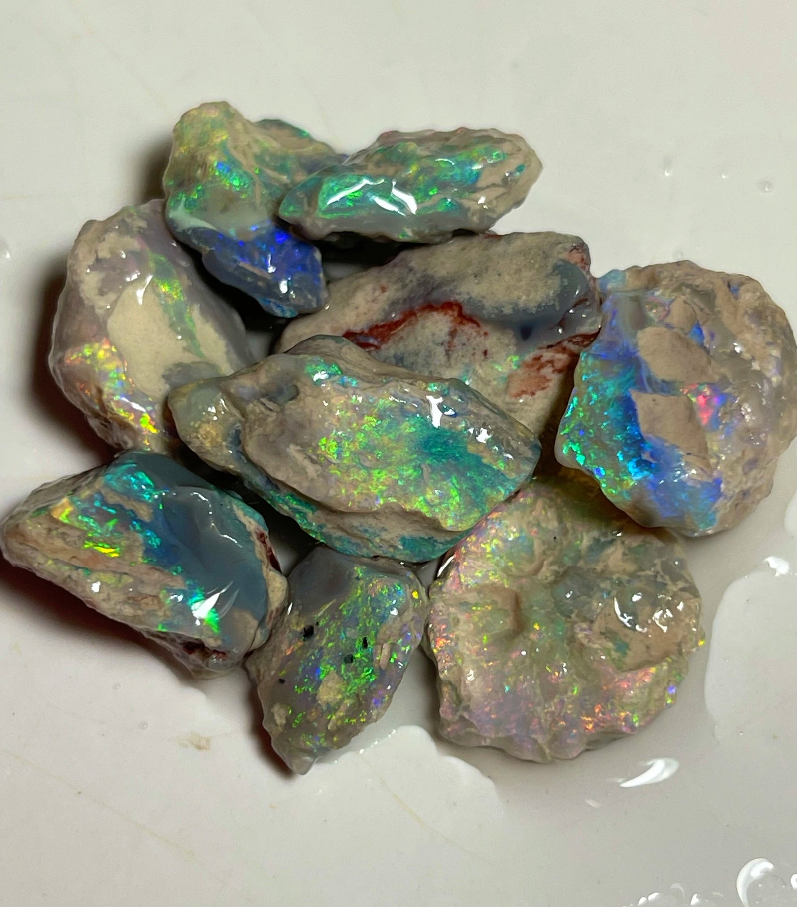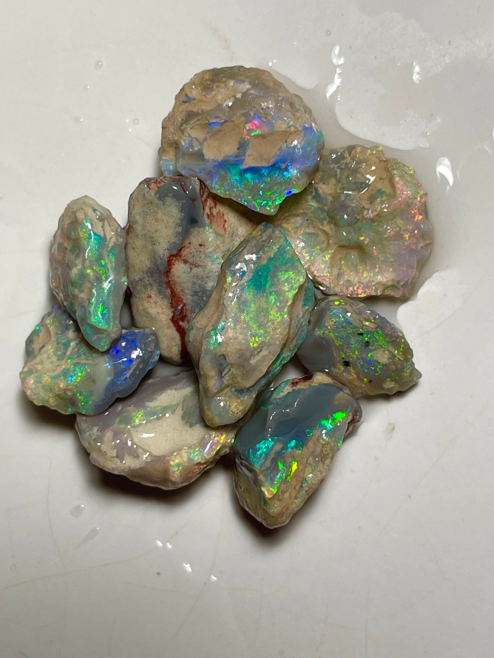 A vibrant parcel of knobby and seam opal formations from Lightning Ridge showing bright multicolour fire, including lots of orange and yellow tones that really lift the parcel. Several stones show clear bar direction and promising face areas. A solid pick for intermediate to advanced cutters chasing warmth, colour contrast, and cuttable potential.